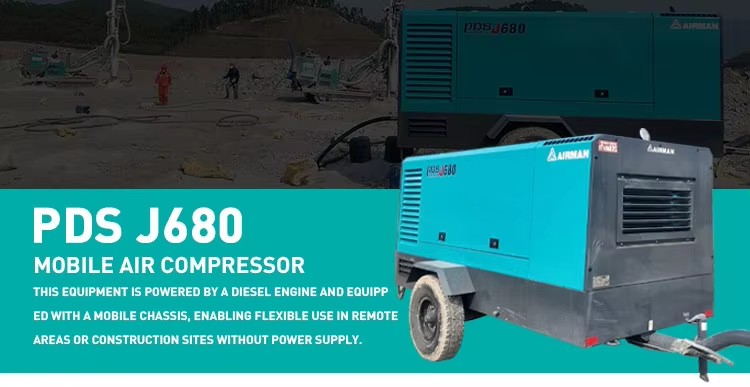 PDS J680 mobile air compressor is powered by a diesel and equipped with a mobile chassis, enabling flexible use in remote areas or construction sites without power supply.